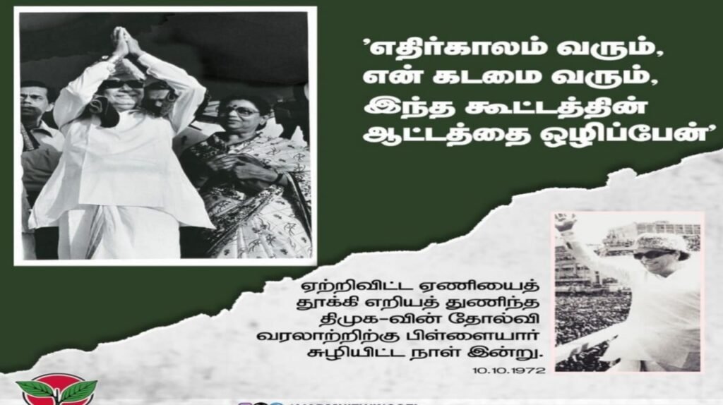 1972 ஆம் ஆண்டு அக்டோபர் 10 ஆம் தேதி தமிழ்நாட்டு அரசியல் வரலாற்றில் முக்கியமான நாளாக நினைவுகூரப்படுகிறது.