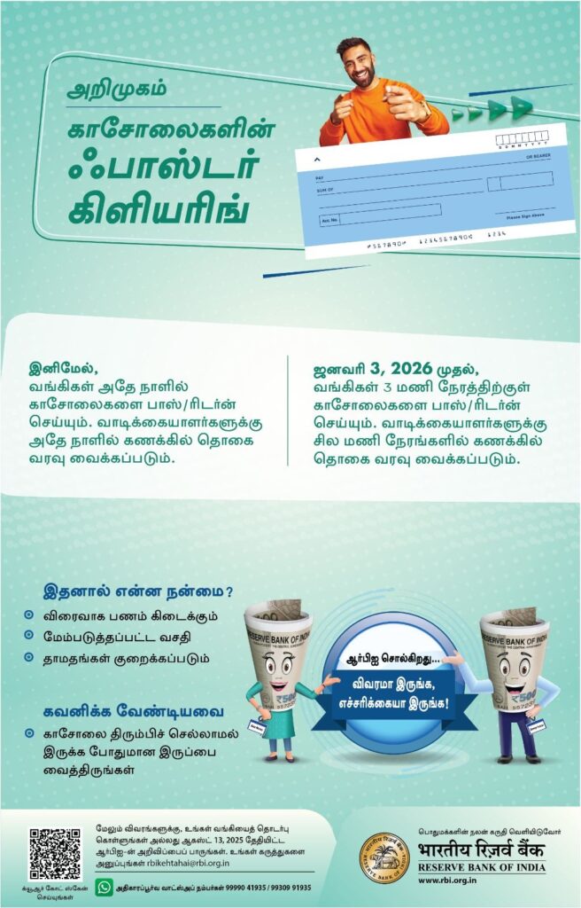ரிசர்வ் வங்கி (RBI) சமீபத்தில் அறிவித்துள்ளபடி, 2026 ஜனவரி 3 முதல், வங்கிகளில் செலுத்தப்படும் காசோலைகள் அதே நாளில் 3 மணி நேரத்தில் சரிபார்க்கப்பட்டு, சில மணி நேரத்தில் கணக்கில் பணம் வரவு வைக்கப்படும்.